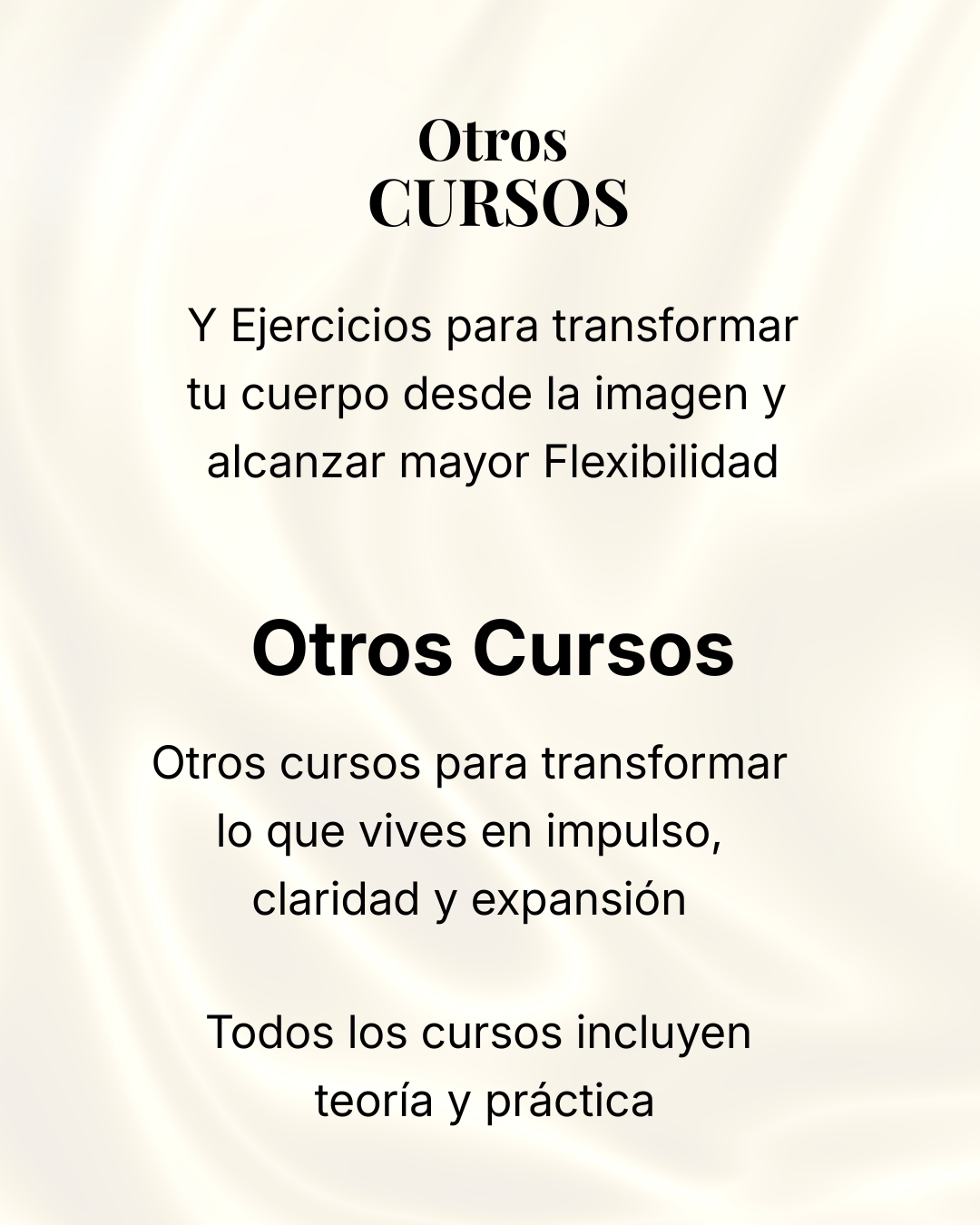 “Hace más de 36 años que me dedico a trabajar el cuerpo. Empecé con el mío propio por motivos de salud y luego trabajé con gente próxima a mi. Después a través de los conocimientos que me fue dando mi propio cuerpo y con la ayuda de un grupo de médicos y psicólogos, creé mi propia técnica corporal, el Método TRCD, la cual me llevó y me lleva a estar activa y receptiva día a día con los mensajes del cuerpo. Dentro de mi profesión, he vivido experiencias de toda índole, algunas buenas y otras no tanto, pero tengo que decir que esas no tan buenas son las que me han ayudado a crecer, evolucionar, y ante todo a madurar de ahí que ahora estoy practicando, vivenciando y enseñando las Enseñanzas de la Calle de la Vida.”